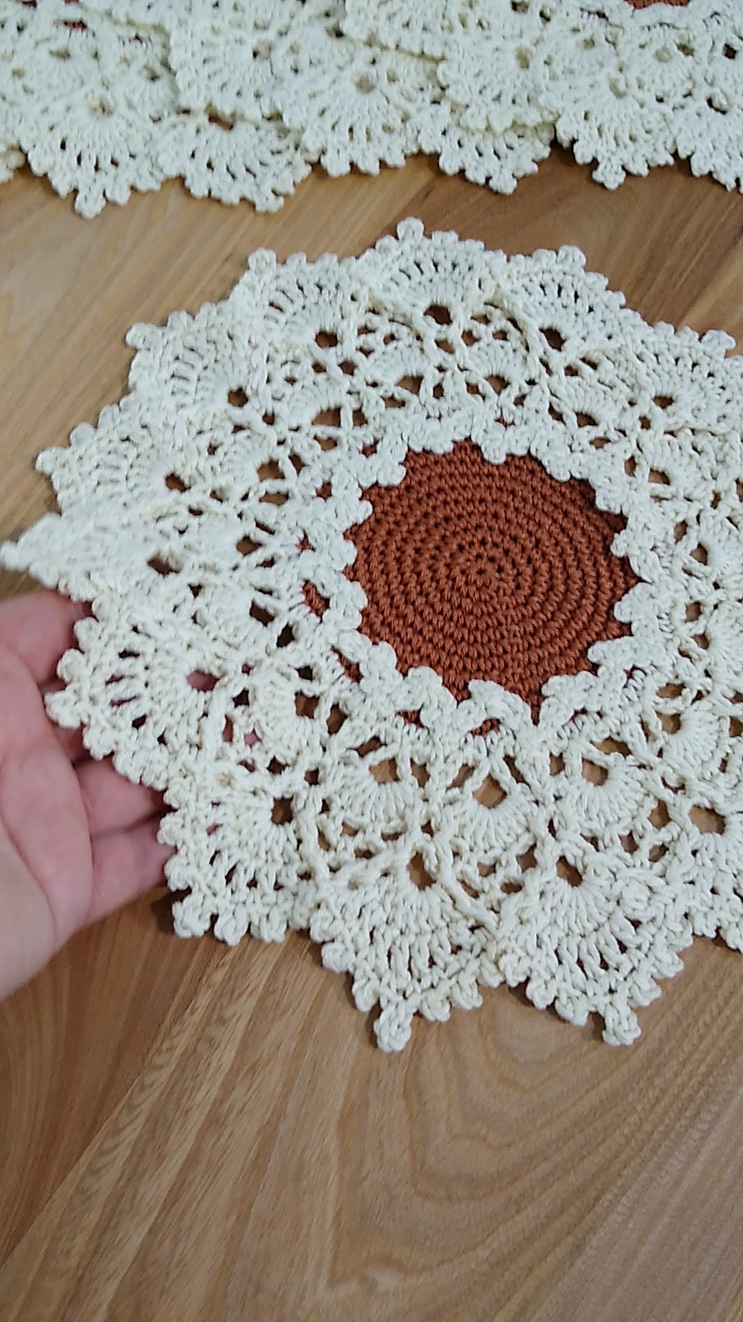 Set of 6 hand-crocheted cotton placemats—soft, absorbent, and reusable—eco-friendly décor that adds texture to farmhouse, cottage-core, or boho tablescapes and makes a lovely gift for sisters, moms, or friends